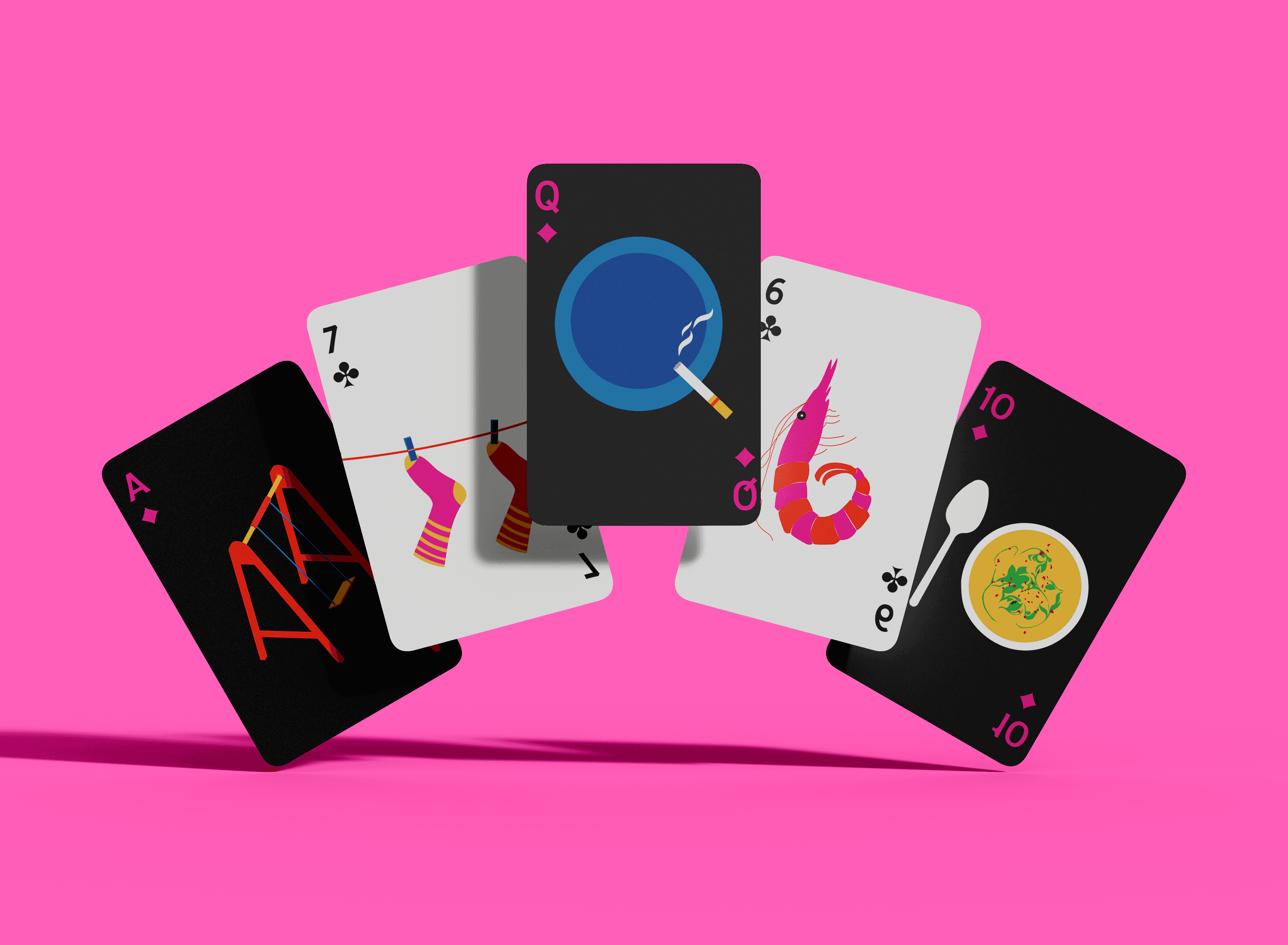Design a set of 52 French playing cards, including its packaging. Come up with a creative and unique concept with a key visual and a colour palette.